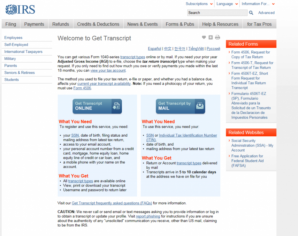If you’re having trouble getting your Tax Return Transcript, check out the IRS’s FAQs at https://www.irs.gov/individuals/get-transcript-faqs or call (800) 908-9946 for assistance.