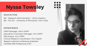 Talk Synopsis: The history of human subjects research is littered with the bodies of abused people. From the Nazi medical experiments in World War II, to the US Public Health Service syphilis experiments in Tuskegee and Guatemala, to the radiation experiments throughout the U.S, we have often experimented on the most vulnerable people in society—those who are poor, young, minority, uneducated, and who lack a political voice. Twentieth century research experimented on populations to prove that they were a different species from other people, to gain knowledge of the human body through trials that were deemed unacceptable to do on “people”, and research populations were chosen because they were convenient or easily controlled. Modern ethical guidelines for conducting human subjects research—respect of persons, beneficence, and justice—come out of the experiences of ignoring these ideas. Today all proposed experiments on humans must undergo some level of review with an institutional review board (IRB) and are required to ensure the physical and psychological safety of participants, that they have sufficient understanding to be able to volunteer as a subject, and that we do not exclude (or include) a population solely because of their race, gender, age, sex, or other characteristic. This talk will explore this troubled past and show how regulatory and procedural efforts are meant to ensure that human subjects are protected from harm, while simultaneously forwarding the search for knowledge.