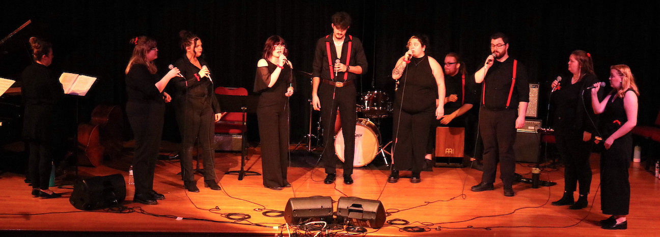 Fall 2023: Voice Dance II (arr. Greg Jasperse), New Day (Arr. Jennifer Barnes), Infant Eyes (Wayne Shorter – combo tune), On May Way from Disney’s Brother Bear (Arr. Jim Clements) Monday’s Bossa (original tune by Gabriel Hoselton), What About Us (Arr. Paul Langford), It’s the Most Wonderful Time of the Year (arr. K. Shaw), The World for Christmas (Anders Edenroth), and Devil May Care (Arr. Kerry Marsh).