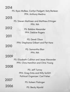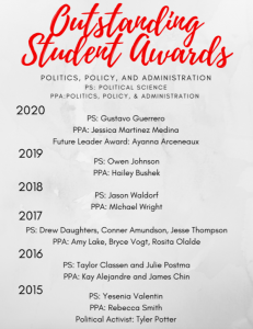 Each year the Politics, Policy, and Administration department selects students who we feel exhibit tenacity, interest in the field and exceptional performance in our classrooms to receive the awards of Outstanding Student in Political Science, Outstanding Student in Politics, Policy, and Administration, and an occasional award for a student who shines in specific categories.