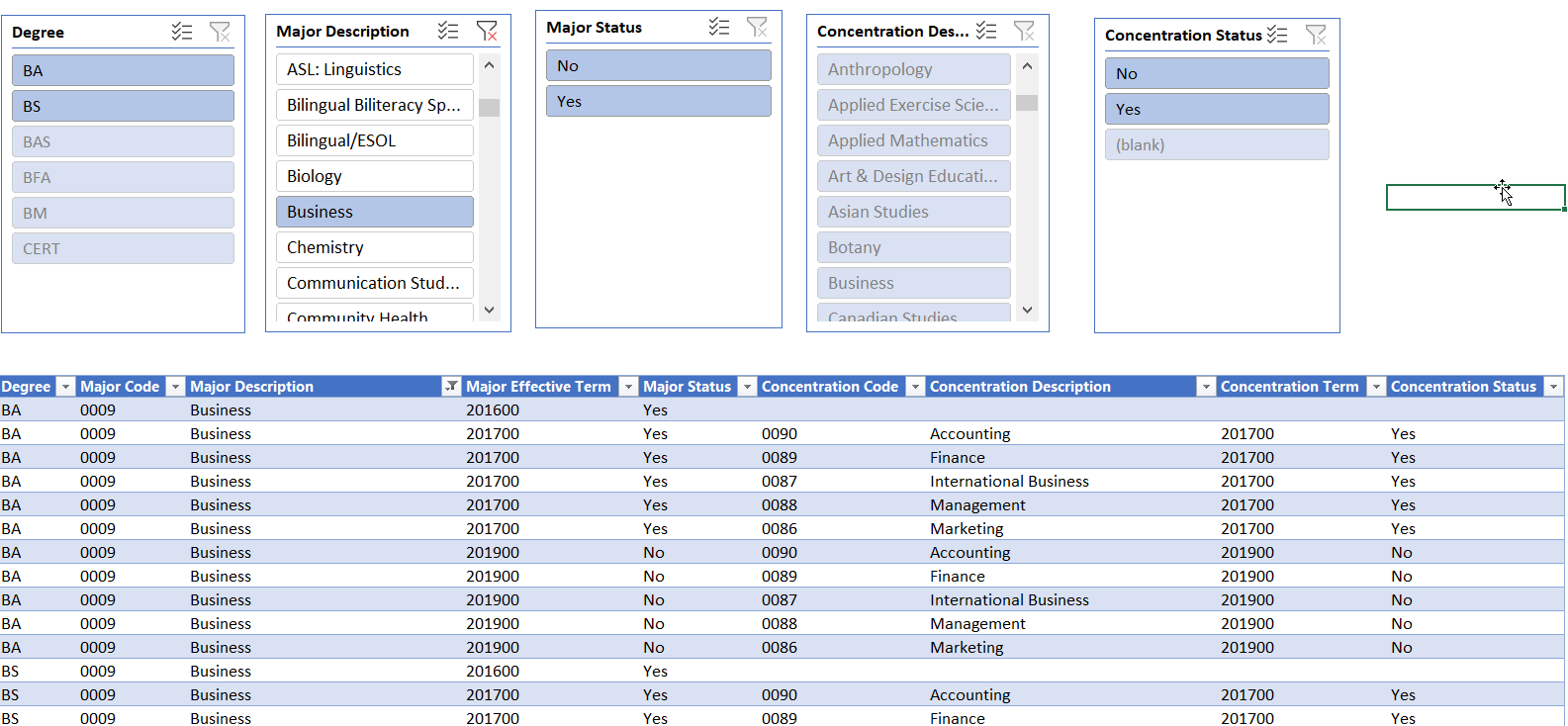 The Active columns indicate if that particular code was active that effective term. For example, effective 201600 the Business major code 0009 did not have any concentrations, hence the blank concentration fields. Effective 201700 the Business major adopted concentrations so the fields are no longer blank and the Concentration Active field contains “Yes”