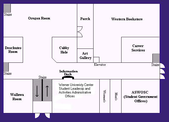 Diagram of Werner College Center prior to 1996 remodel, first floor.