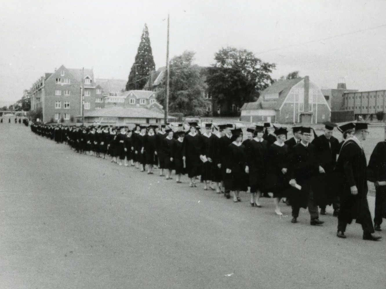 In 1972, the Student Center underwent its first major renovation. The name was changed to the “College Center” at that time. Pictured here are graduating seniors walking from the College Center to the Commencement ceremonies.