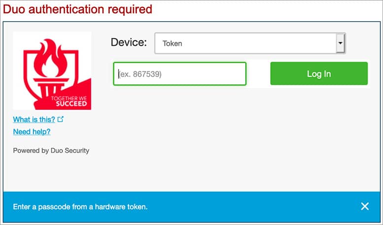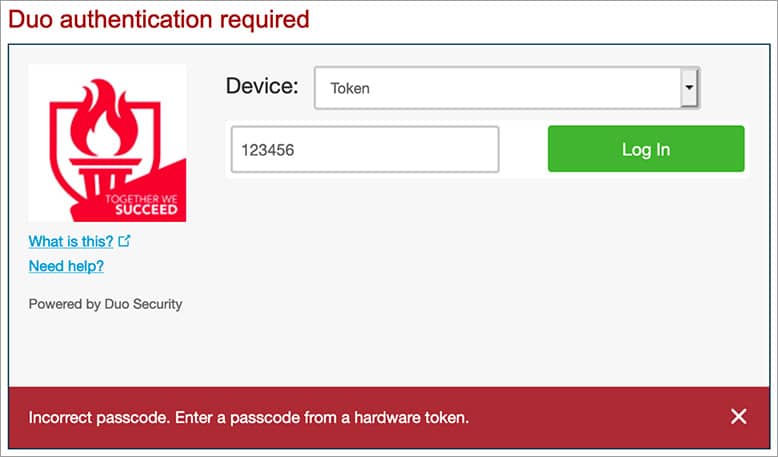 Enter the next two codes that appear on your hardware token, and on the third attempt your token should be re-synced with Duo and you will be logged into Portal. If on this third attempt you are still unable to log in, please stop by UCS (located in ITC 009) and we will help you re-sync your token.