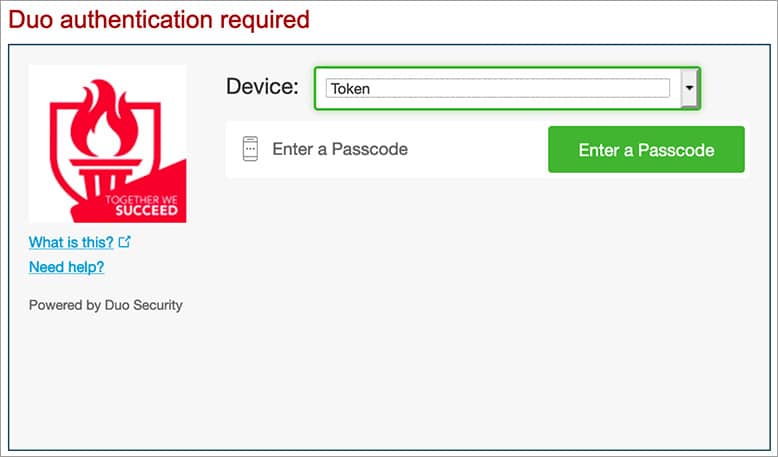 To re-sync your token, log in to Portal, then when the Duo prompt appears, choose “token” from the drop down menu. Then, click the “Enter a Passcode” button.