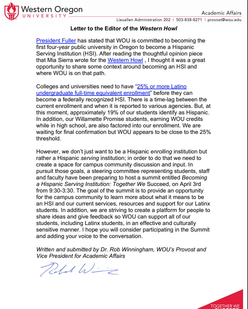 President Fuller has stated that WOU is committed to becoming the first four-year public university in Oregon to become a Hispanic Serving Institution (HSI). After reading the thoughtful opinion piece that Mia Sierra wrote for the Western Howl, I thought it was a great opportunity to share some context around becoming an HSI and where WOU is on that path.