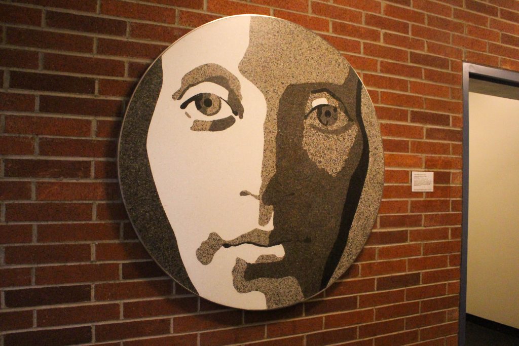 The second piece: Inside the south entrance of Bellamy Hall, the second piece in this collection titled, “Self-Reflection Progression: Portrait,” presents a more formed version of the face outside. Rather than simple line work, it has dimensions using faux limestones and brass.