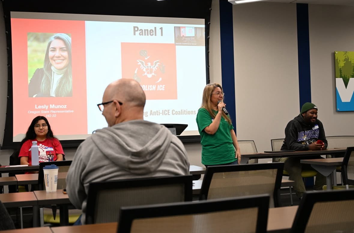 A photo of state representative, Lesly Muñoz, talking about ICE in a presentation | Photo from @salem_dsa and @wou_ydsa on Instagram