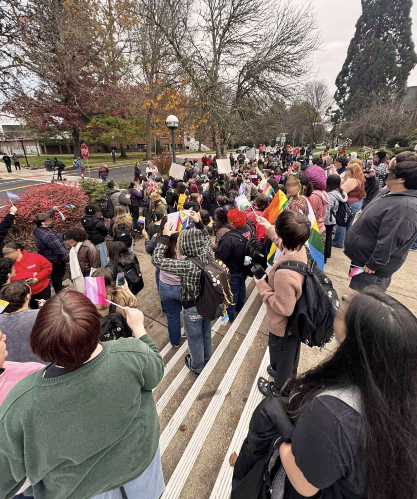University president, Jesse Peters, emailed a statement to the campus population: “You may have heard about the masked protesters wearing MAGA hats who gathered in front of the (WUC) this afternoon, attempting to promote messages of divisiveness and hate. We understand that these messages can feel personal and triggering, and you may feel compelled to engage with them. It is important to remember that exercising your right to express yourself is protected by both the US and Oregon Constitutions for all parties involved.”