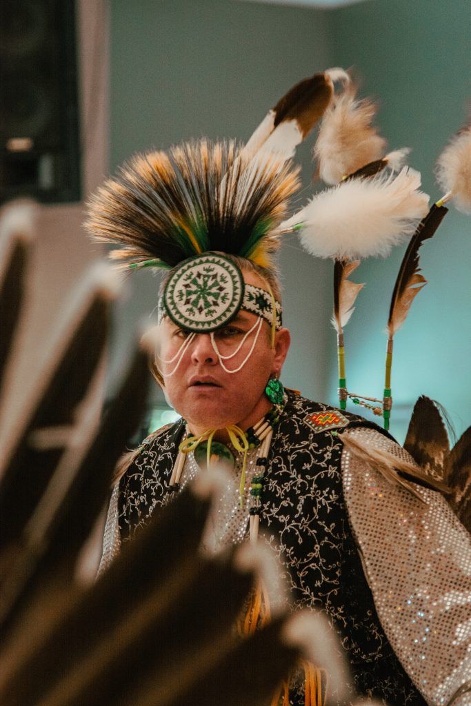 Once this was accomplished, the dancers lined up outside of the room, behind the Color Guard carrying the flags into the room, to kick off the First Grand Entrance. With the American flag, Oregon flag and the Eagle Staff — which is a Native American flag — leading the way, the dancers followed the beat of the head drum as they danced into the hall to start the event.