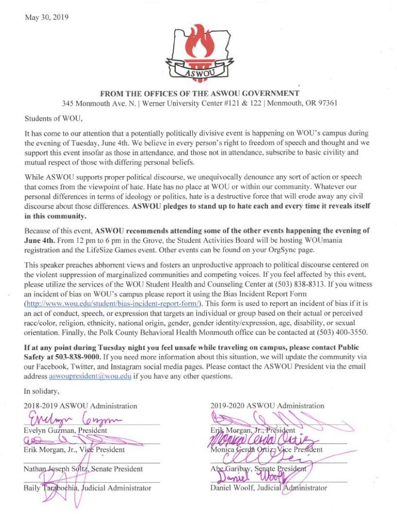 Since ASWOU’s last letter to you all on May 30, 2019, the situation surrounding Tuesday, June 4th’s controversial event has escalated. Third-party organizations not affiliated with WOU have begun targeting the WOU campus with calls to organize protests to the event. Also, WOU students have been targeted in social media posts from both supporters and protesters of this event.