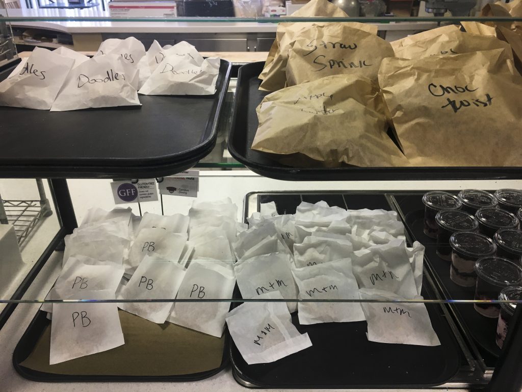 Some of the necessary precautions taken include moving the salad bar and breakfast area behind the line, so that students now have to be served instead of serving themselves — even for utensils. Fruits and baked goods are now wrapped, and sanitizer stations are readily available throughout the establishment.